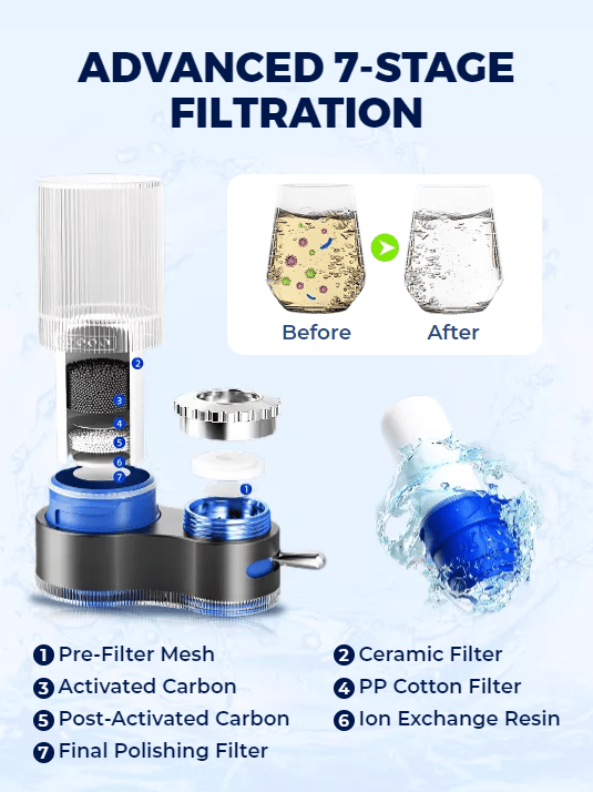 7-Stage Multi-Effect Filtration: Removes chlorine, lead, and other contaminants for pure, clean water.